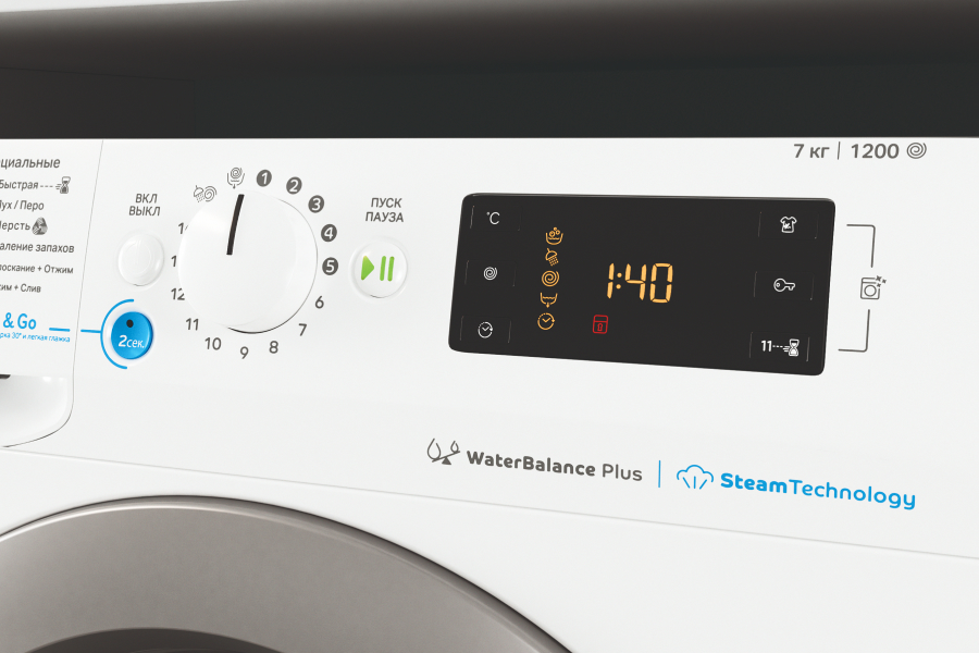 Интересное решение – функция Push&Go Steam, предназначенная для повседневной стирки. Можно загрузить вещи, нажать одну кнопку, а дальше машина все сделает самостоятельно. В конце цикла она обработает вещи паром, поэтому глажка будет особенно простой и быстрой.